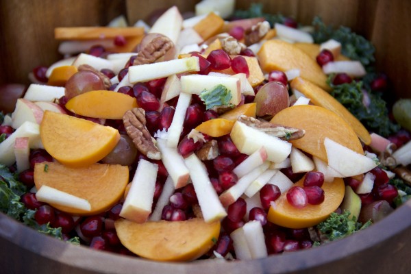 Wash and chop kale into small pieces. Cut the apples into thin slices, (about 2 inches long). Cut the tops off the persimmons and cut into long slices. To seed the pomegranate, place it in a bowl of water and cut in half. Then remove the seeds under water. This prevents the juice from squirting all over. Place all the above ingredients into a large bowl.